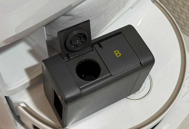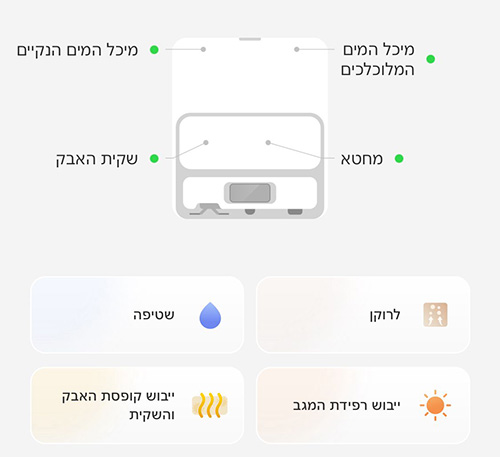 - לרוקן – פעולת ריקון קופסת הזבל והאבק מהשואב הרובוטי לשקית האשפה בעמדה.