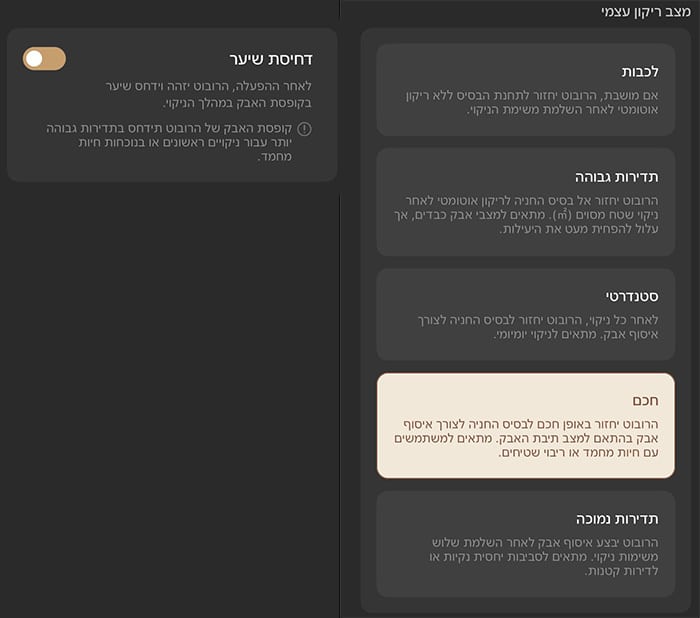 ניתן לקבוע את תדירות שטיפה מגב בזמן ניקיון – מתי השואב יחזור לבסיס לשטיפה במהלך הניקיון.