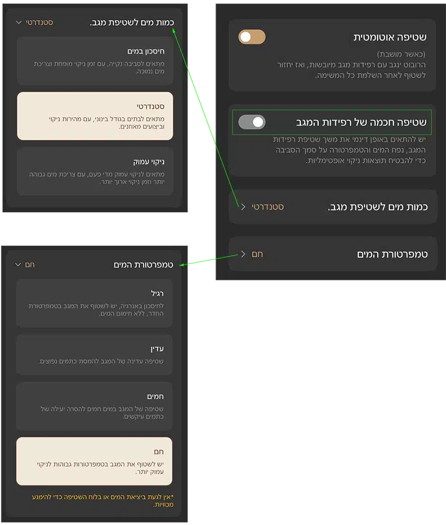 בטלו את האפשרות: “שטיפה חכמה של רפידות המגב” כדי להיכנס למצב ידני ואז הגדירו את כמות המים וטמפרטורת המים.