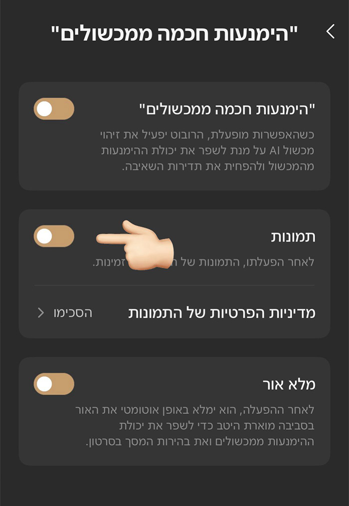 הגדרות -> ״הימנעות חכמה ממכשולים״ -> “תמונות”: מופעל