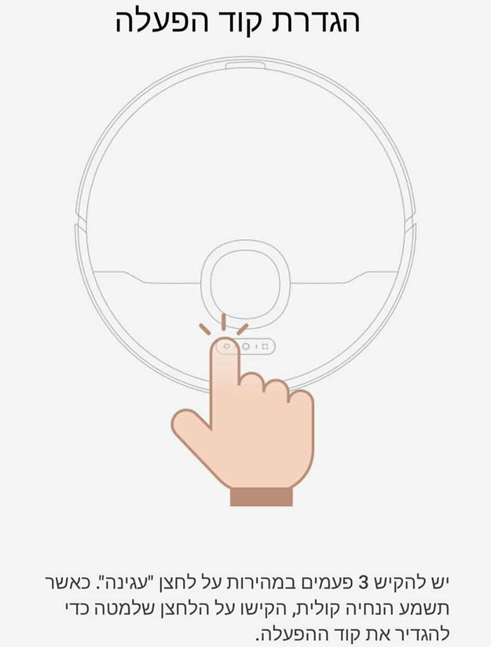 מנגנון האבטחה יבקש ממכם פעם אחת לקשר בין האפליקציה למצלמה בשואב ע”י לחיצה 3 פעמים במהירות על כפתור “עגינה” (אייקון של בית) וישר לאחר מכן תתבקשו להזין קוד אישי להפעלת המצלמה.