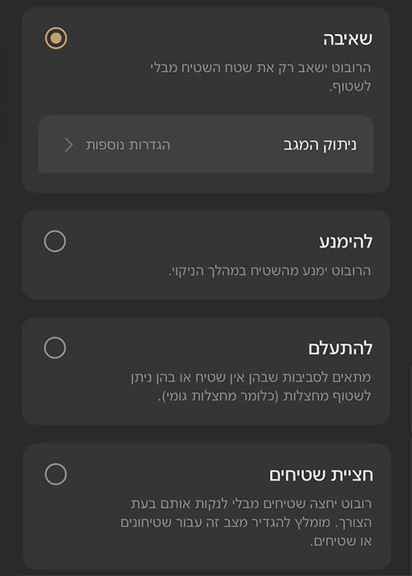 רצוי לבחור באפשרות “ניקוי השטיחים תחילה” תחת “אפשרויות נוספות” כך הרובוט יסיים קודם את שאיבת כל השטיחים בבית, ורק לאחר מכן יתפנה לניקוי שאר הרצפות.
