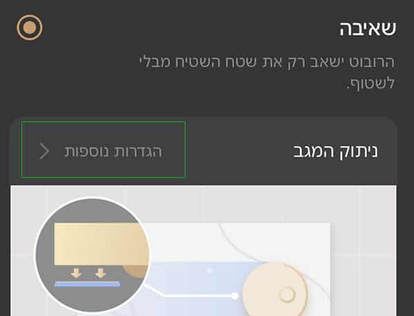 לניקוי השטיחים בבית נבחר במסך “הגדרות ניקוי שטיחים” את האפשרות: “שאיבה” ואז נבחר ב-“הגדרות נוספות” להתאמה לסוג הניקיון שלכם.