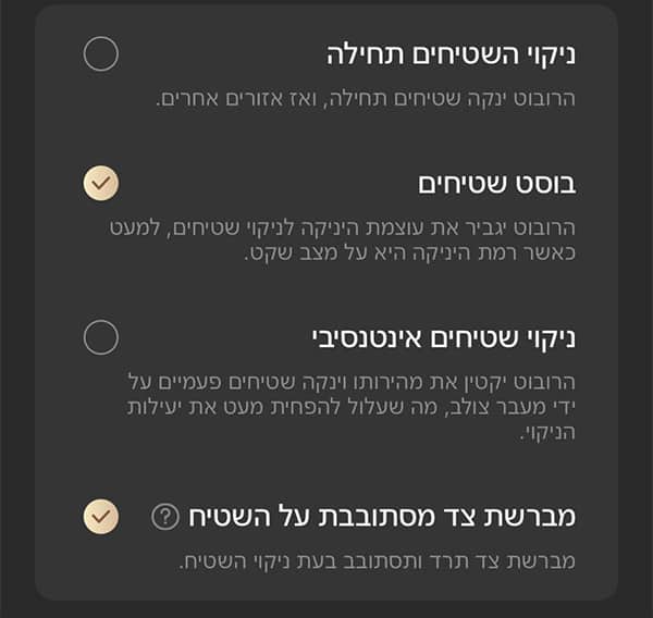 בתפריט “הגדרות ניקוי רצפות“, תמצאו אפשרויות נוספות שכדאי להכיר בנושא שאיבת השטיח.