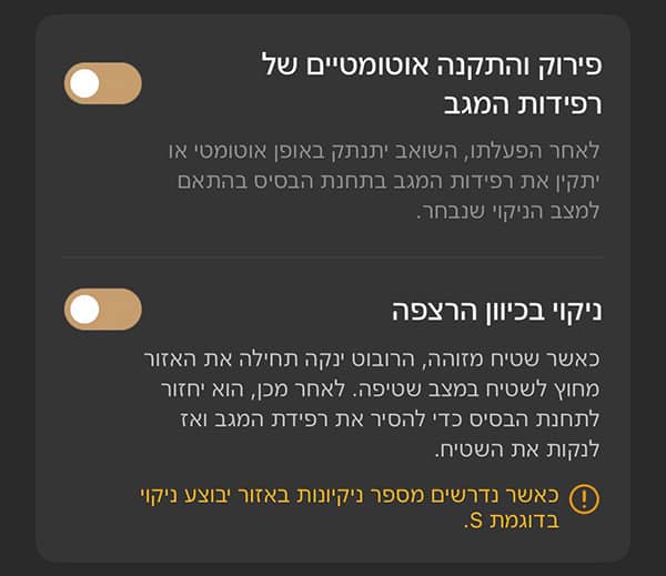⚙️ אפשרות זו נמצאת תחת תפריט: “הגדרות ניקוי רצפות” -> “פירוק והתקנה אוטומטיים של הרפידות המגב“.