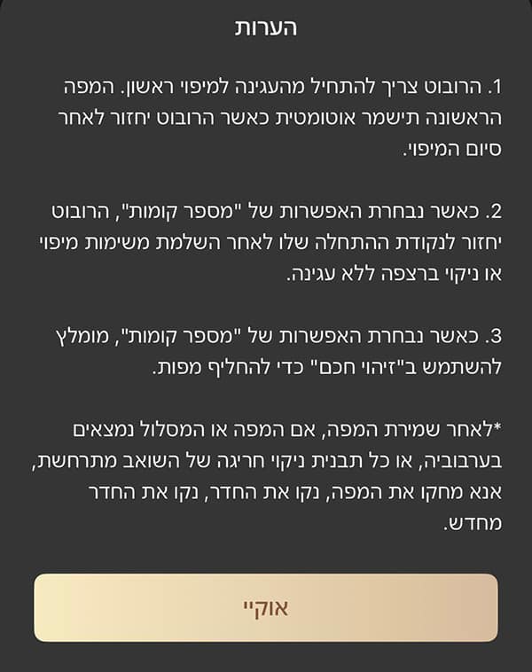 💦 אם הרובוט הוחזר לעמדת העגינה לצורך תחזוקה במהלך המשימה, יש להשיבו לקומה המקורית תוך 15 דקות כדי שימשיך בעבודתו.