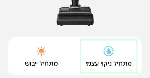 באפשרותכם להפעיל את הניקוי העצמי דרך האפליקציה בטלפון הנייד או באמצעות לחיצה על כפתור הניקוי העצמי שנמצא על השואב.