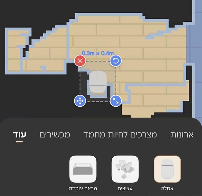 ניתן להגדיל/למתוח, להזיז למיקום הרצוי, לסובב (90 מעלות בכל פעם) או למחוק את הרהיט.