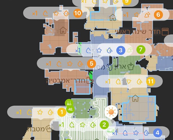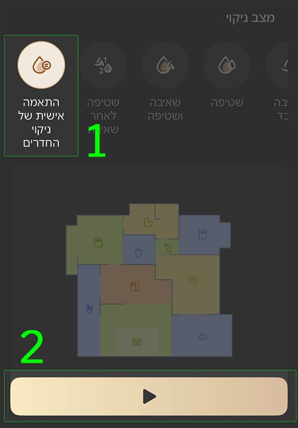 לאחר שהגדרתם את התוכנית, תוכלו להפעיל אותה בקלות דרך האפליקציה: עברו למסך “מנהג”, בחרו ב”התאמה אישית של ניקוי החדרים” ולחצו על כפתור ה-▶️ להפעלת הניקיון לפי ההגדרות שקבעתם.
