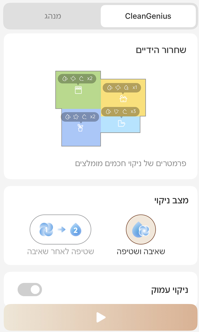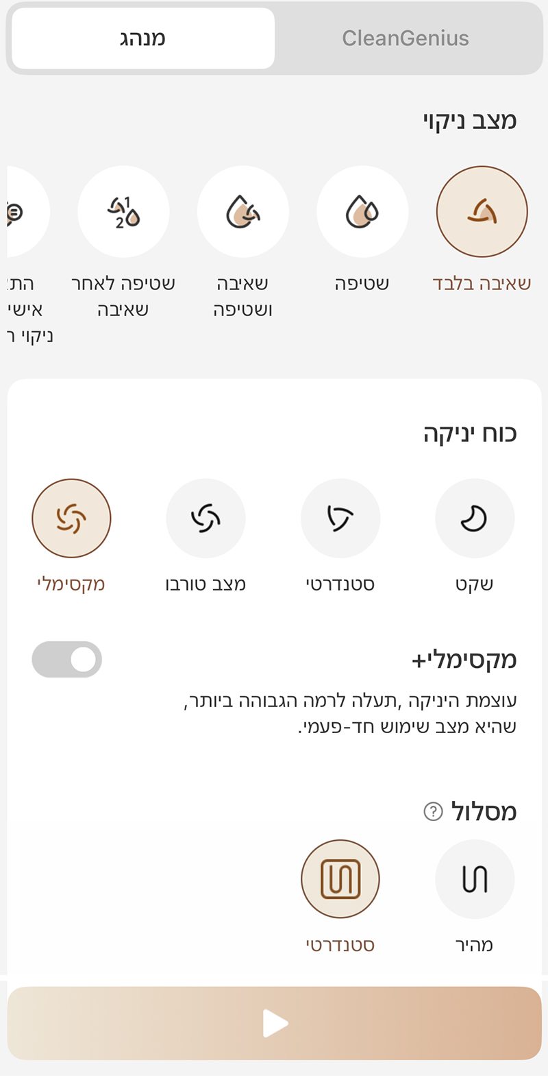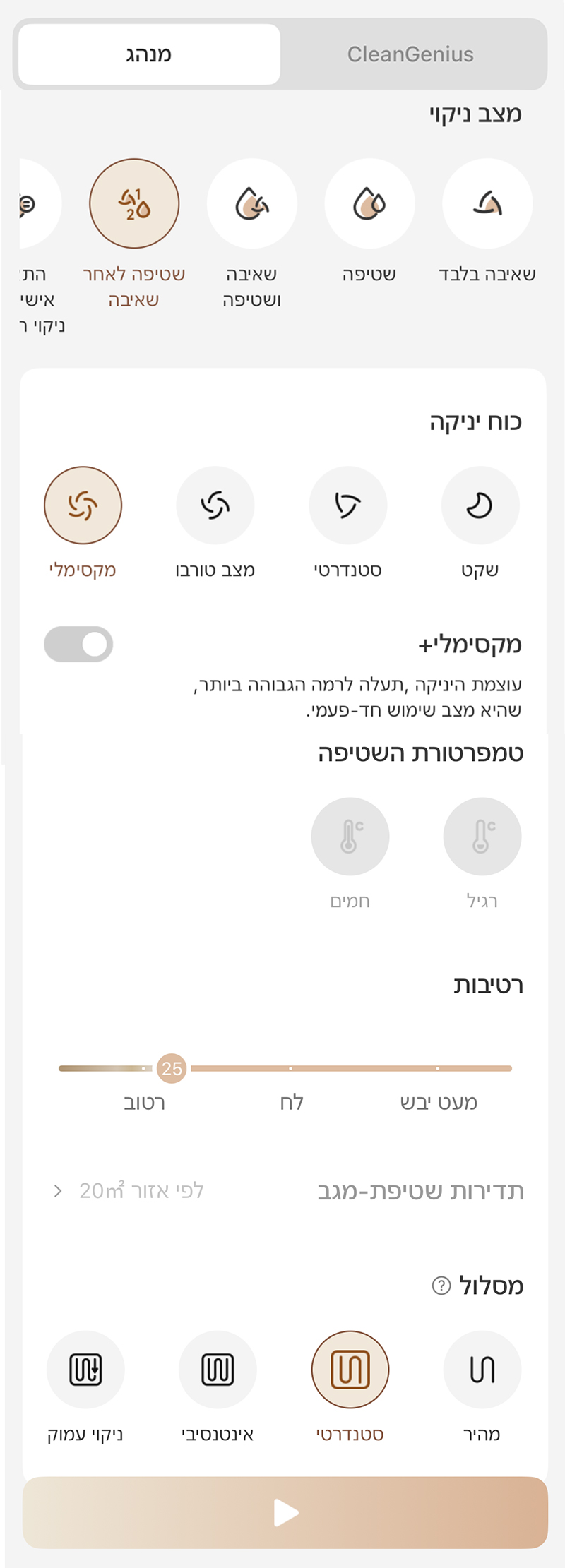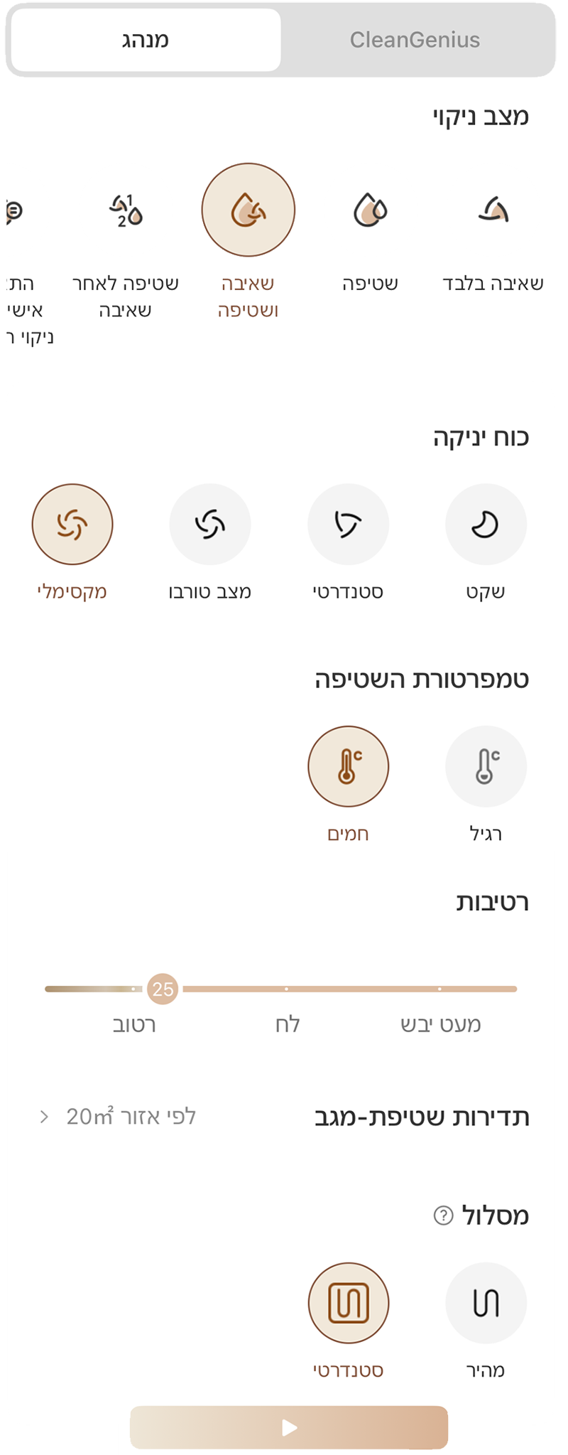 ⚙️ מסלול: סטנדרטי (עוצמה רגילה), אינטנסיבי (ניקיון מחוזק), ניקוי עמוק (נקיון יסודי ובית מלוכלך מאוד)