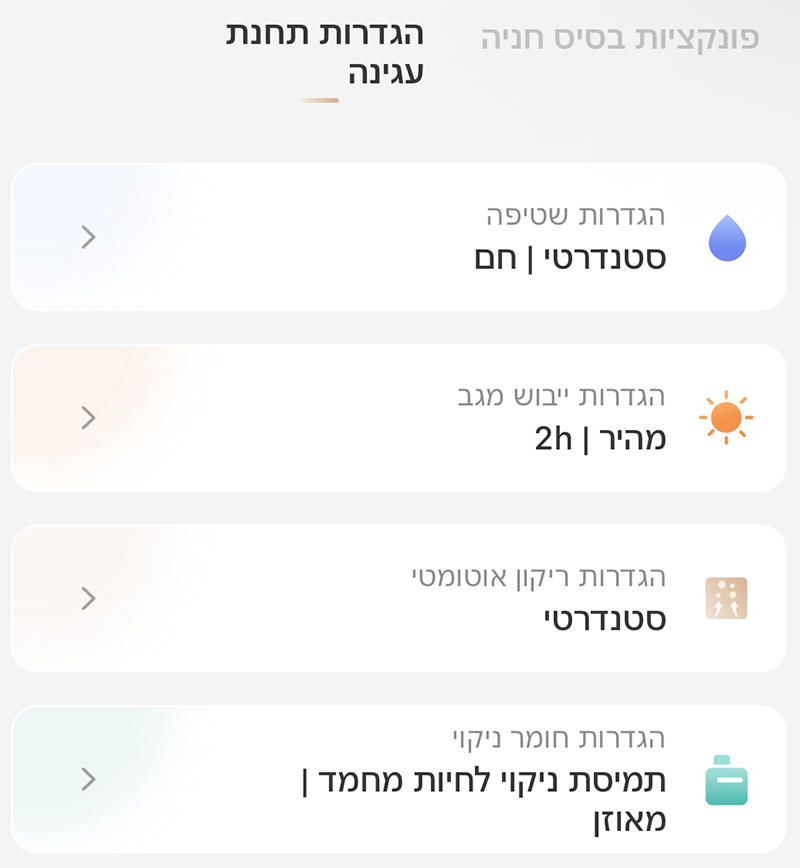 דרך פאנל הניקיון באפליקציה ניתן גם לבצע מספר פעולות ניקיון ידניות על תחנת העגינה והגדרות תחנת עגינה.