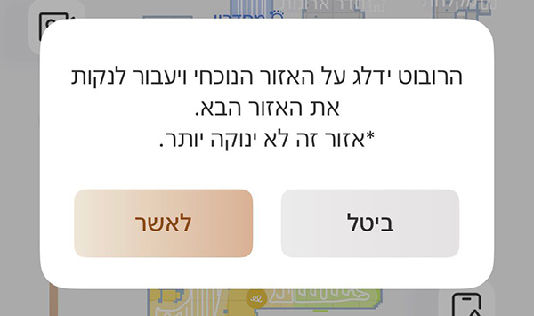 התחרטתם ואתם לא רוצים שהשואב ינקה את האיזור הנוכחי? תוכלו לבטל את האיזור הנוכחי שאותו השואב מנקה והוא יעבור אוטומטי לאזור הבא.