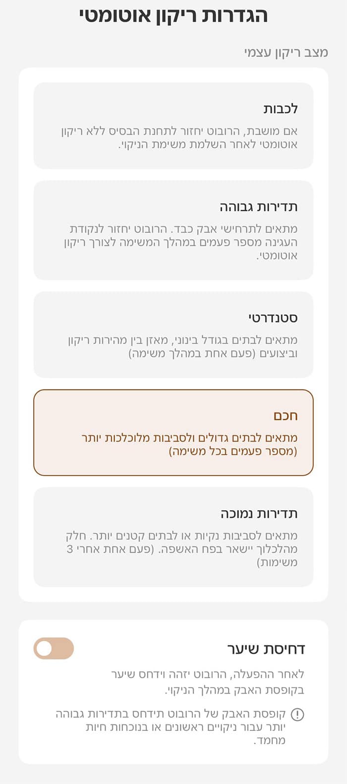 ⚙️ מצב ריקון עצמי: תדירות גבוהה (לבית עם הרבה לכלוך – מומלץ) / חכם (לבית עם לכלוך רגיל)