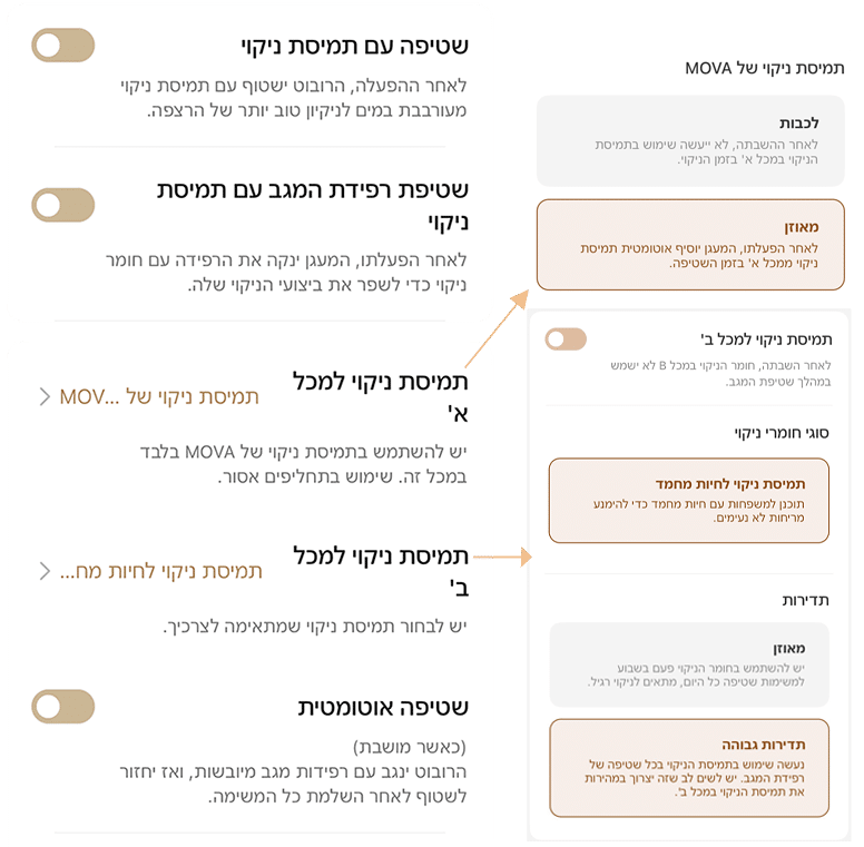 במידה ושמתם את חומר הניקוי של Mova במיכל הנזולים בעמדת העגינה, יש להגיד לפי ההגדרות הבאות את חומר הניקוי: