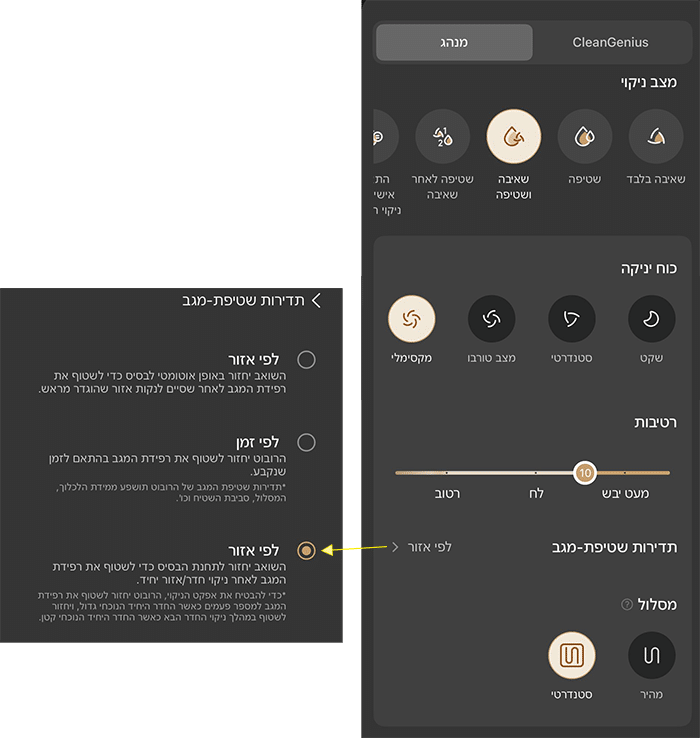 הערה: הגדרה זו תחזיר את השואב לניקיון לאחר כל חדר או אזור נבחר בזמן הניקיון, זה מאוד חשוב כי הרולר סופג את המים והלכלוך ולכן חשוב שהוא יחזור לעמדה להתנקות כמו שצריך ואז ימשיך במשימת הניקיון…