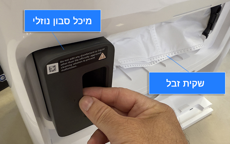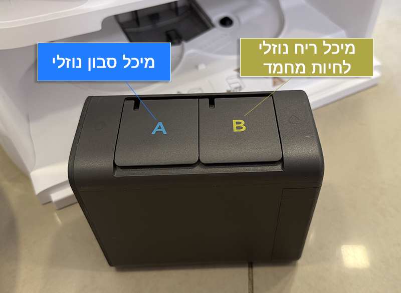 לאחר המילוי, יש להכניס את מיכל הסבון לעמדה.